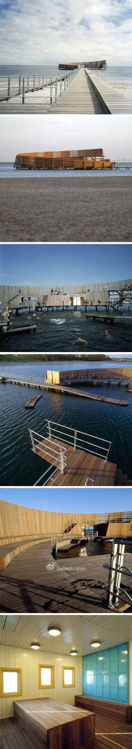 这个浴室是一个艺术品般的动态形状。从海滩,海中,和空中都能看到它。它的轮廓是会随着游人在它周围位置的变化而变化的。海上浴室很重要的一个概念是它免费向公众全天开放。这里给想夜泳,运动,游戏的游人提供了空间。
