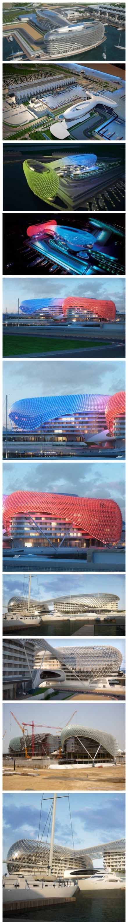 建筑面积约8.5万平米,有500间客房,是耗资360亿美元的Yas码头开发项目的一部分,由渐近线事务所设计。覆盖建筑的跨度217米的曲面网状钢结构上镶有5800块可旋转的玻璃。