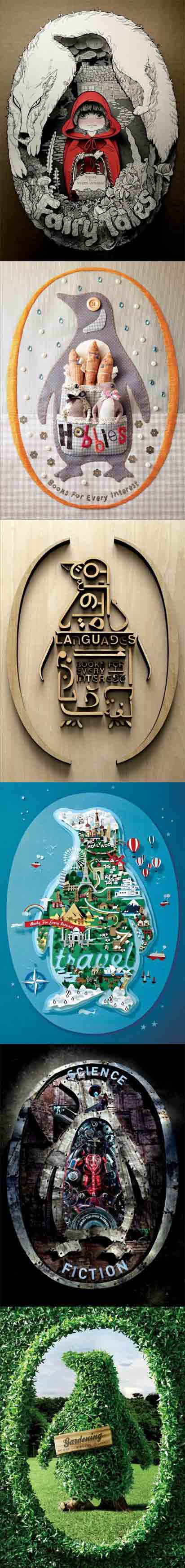 马来西亚Y&R广告公司为企鹅出版社所作的广告,使用不同的风格和质感,演绎该出版社的经典LOGO,分别代表不同的图书类目:童话、兴趣、语言、旅行等。