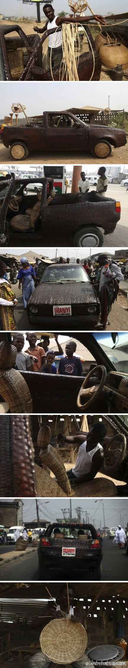 来自非洲的编织工匠Ojo Obaniyi為了推销自己20年手艺编织的商品,但又没有多余预算可以做广告,于是他将棕櫚叶编织在整台货车上,从里到外不放过任何一个细节,不管是仪表板、方向盘、座椅、后视镜、全车的外观,甚至是轮胎钢圈都用棕櫚叶包覆起来,做工精细的程度着实令人咋舌。