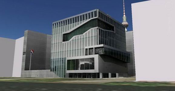 雷姆·库哈斯和艾伦·凡·鲁恩设计的荷兰驻德国大使馆新馆位于柏林亚历山大广场后面,距离使馆区较远,于2003年11月建成。评委对它的评价是“空间宽阔、综合性强、富于创新、惊喜无处不在”。