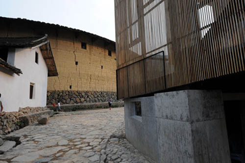 李晓东去下石村的时候,福建土楼刚刚申遗成功。但并非所有土楼都就此风光无限,得到应该有的保护和修缮,“下石村一条小溪的两岸,有两座土楼,没有人住,都快坍塌了。传说以河为界的两个土楼以前是两个村,经常打架,所以中间用小溪隔开,老死不相往来。现在两个村早合并了。土楼窗户小,通风不好,现在村民也不住了。”不但土楼荒废,村子本身也没有凝聚力。“小溪边尽是垃圾,到处都很肮脏。没有公共的地方,所以村民没有认同感,没有向心力。应该提供一个公共场所,我找到的点就在两个土楼中间,把学校修在小溪中间——小孩是未来,需要照顾。这个点离村民都很近,将来也可以把土楼再利用起来。”