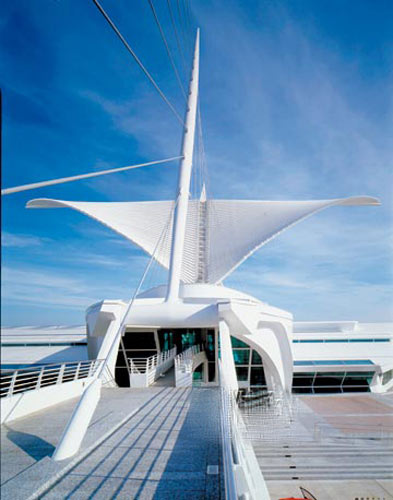 无独有偶,由卡拉特拉瓦操刀的另一个美国建筑物,也和飞鸟颇有渊源。在2001年美国《时代》周刊评选的年度设计榜上,美国威斯康星州密尔沃基美术馆位居榜首。卡拉特拉瓦为美术馆设计的机械传动装置,控制着建筑顶部的两块钢结构“羽翼”,当阳光流转,“羽翼”便会自动开合,光线白驹过隙般地在两边的“羽毛”间荡漾。整个美术馆就像在湖边静谧地“微颤”。