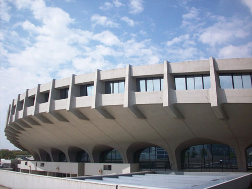 1964年建成的东京代代木国立室内综合体育馆是为第18届奥运会修建的。体育馆总用地面积 9.1公顷,南北有近6米的高差。第一体育馆为两个相对错位的新月形,第二体育馆为螺旋形,像个大蜗牛,两馆均采用悬索结构,中间的空地形成中心广场。宽敞的人行步道将两馆联系起来,贵宾和管理人员入口在步道的下面。观众人流和车流也巧妙地分开了。