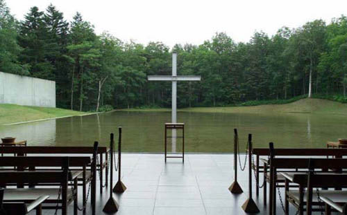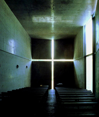 设计时,安藤忠雄在教堂的一面混凝土墙上挖了一个空的十字架,当阳光照到混凝土墙上时,从教堂门口看去,会有一个光影的十字架呈现在眼前。这个项目建成后得到很多人的喜爱和称赞。后来,又有业主让他设计了一个水的教堂。这个教堂的室外环境很优美,教堂的外墙用玻璃制成,如果将玻璃墙全部打开,就是一个室外教堂。室内与室外环境和谐交融,冬天的景色更加别致。