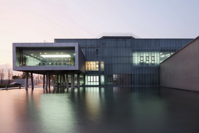 嘉定新城规划展示馆,建筑体现了一种远眺风景的姿态,无论是平卧在水中的体量,还是以群柱踮脚站立在水面上的体量,都提供了尽量开敞的视野与可供室内外活动之用的屋顶平台。
