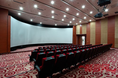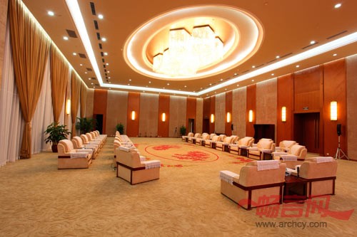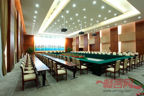 一楼多媒体会议厅采用三面围合式的会议台布局,设主席台,主席台后方主壁设计一暗藏式多媒体显示屏,主璧背景可根据会议形式做调整。会议厅左右两侧的LED显示屏可以实时播放主席台画面及重要文件,方便了左右两侧后排与会人员的互动。以单一的木饰面为主要设计材料,与建筑外观元素融为一体。