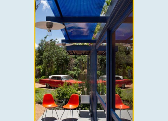 Vitra橙色的Eames塑料边椅与房子明亮的蓝色形成强烈的视觉冲击。如此鲜明的色彩也是建筑的魅力所在。