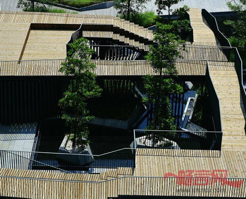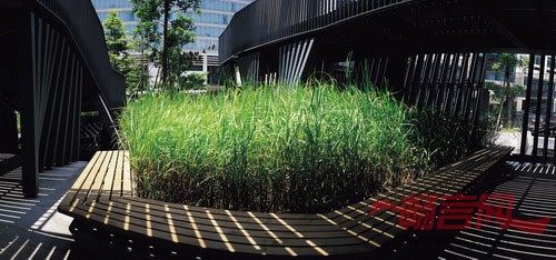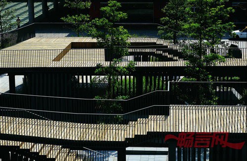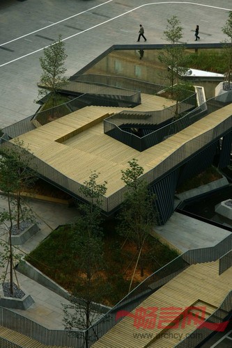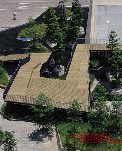 一座曲折错落的景观桥体镶嵌于异形水池与植物种植容器之上,成为主景。围绕桥体组织交通流线,链接离散空间。桥底设置数排光影柱,轻盈宛如波光流动。桥面分割成不同尺度的踏面,分作交通与休憩之用。桥下遮阴,桥上休憩。以形态本身来满足人性需求;同时,人在行动中滞留,成为风景。看与被看,正是戏剧的张力之美。