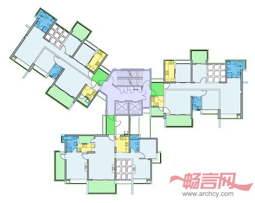 高层住宅充分利用外部的景观资源为主导,户型设计强调外部景观和开阔视线。住宅平面主要采用大面宽的板式和两梯三户的点式平面。布置于地块中偏南的多、低层住宅先天具有亲地的特点,小区内部景观占有的优势明显,在心理上拉近了人与郊野公园景观的尺度。不同位置的住宅对于环境来说各有所取,体现住宅设计的均好性。
