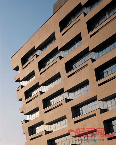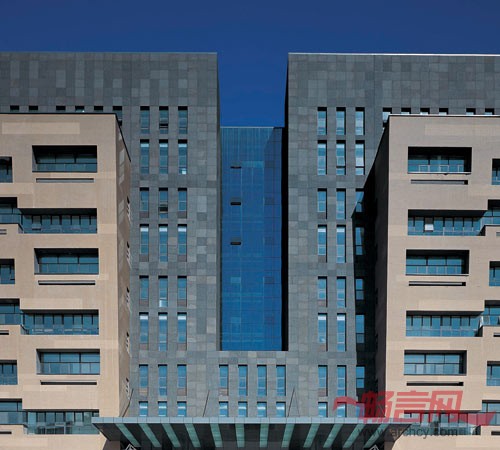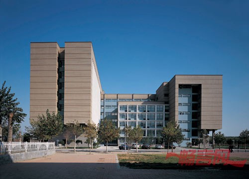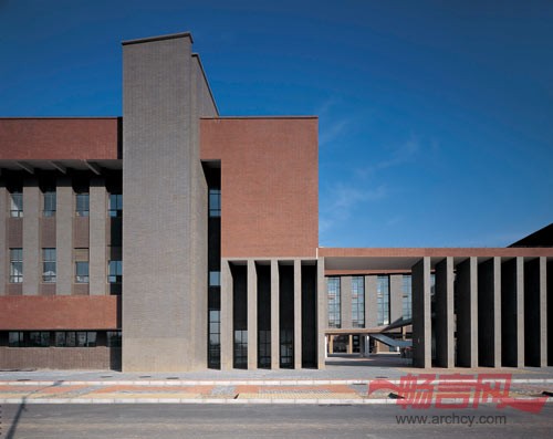 北区综合楼如“铜鼎”般伫立在校园中央,厚重、质朴,富有震撼力,且立面窗户的错动又抽象化的暗合了“回纹”的形意。北区主建筑群方圆嵌套的模式除了在形态上和空间组织的考虑外,也是对淄搏当地气候的积极回应,面向南向开口的“环”阻挡了冬天寒冷的北风,却能把夏季阴凉的南方空气引入到建筑群之中。