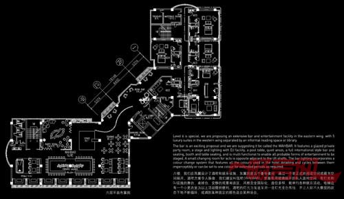 六楼:我们在西翼设计了酒吧和娱乐设施,东翼则是五个豪华套间,通过一个非正式的阅读空间或藏书空间隔开。酒吧方案令人振奋,我们建议叫佤吧(WAHBAR)。里面有用玻璃隔开的私人派对空间、有灯光和DJ设施的舞台、桌球台,安静的观景闲谈区,风格完全国际化,座位多样,能举行各种娱乐活动。电梯边有一个小更衣室为以上活动提供便利。酒吧的灯光方案是采用一套灯光变色系统,并让大家不大察觉的状态下地不断循环,或调到某种固定的颜色适合某种场合。