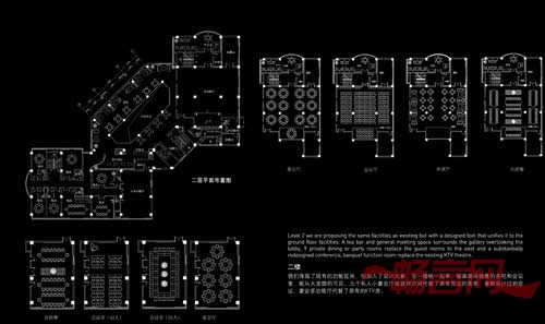 二楼:我们保留了现有的功能区间,但加入了设计元素,与一楼统一起来。一个茶吧和会议室包围着画廊,俯视着大堂,九个私人小宴会厅或派对空间代替了原有西边的客房,重新设计过的会议、宴会多功能厅代替了原有的KTV房。