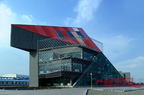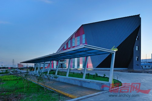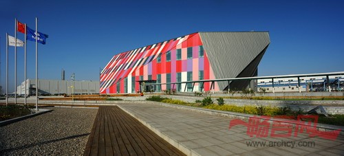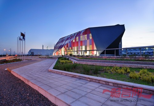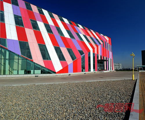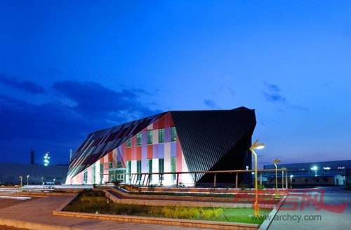 立面采用现代感强的合金镀锌波纹板,以不同的颜色,和独特的造型特点作为立面设计的主要手法,在宁夏地区灰大干旱的气候条件下,防止风沙腐蚀,红白色立面主要色彩使得建筑成为该地区吸引视线的地标性建筑,金属色彩斑斓的外表皮也映衬出现代化企业的高科技兴性质。