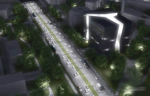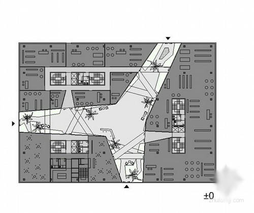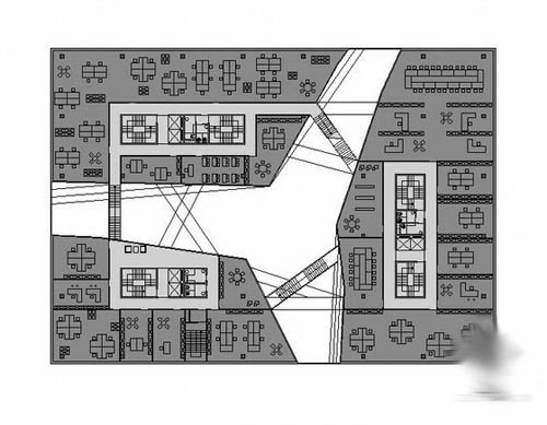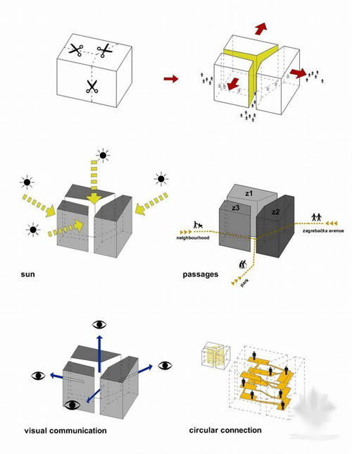 这个项目位于复杂有力的城市环境中,周围由繁忙的道路,公园空间和住宅空间,设计方案的目的是为了解决项目内部自身的城市特性,同时为周围的发展起到一定 的引导作用,设计师通过一个立方盒子的形式实现此个目的,同时在内部切入很多通道,以突出环境对内部方向线条的影响,另外将使用者进一步拉近到内部的环境 之中。