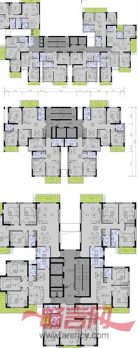住宅设计的重点主要是户型设计和楼栋的拼合。在有限的场地中,对建筑形式的要求更加苛刻;不仅尽量缩短面宽,也要尽量缩短进深,才可以保证基本的日照通风要求。我们比较了许多标准层平面,最终定位为现在的标准层样式(北侧的1#楼和2#分布主要分布大中户型,南侧的3#楼面宽展开,主要布置中小户型)以上基本定型后,户型设计才能展开。在户型设计中突出南方住宅的特点,把大、中、小户型都设计为全明户型。由于户型最大仅120平方米,所以我们尽量减小楼梯走道占去的面积,把公摊控制在13%左右。中小户型可分可合,提高了灵活性。