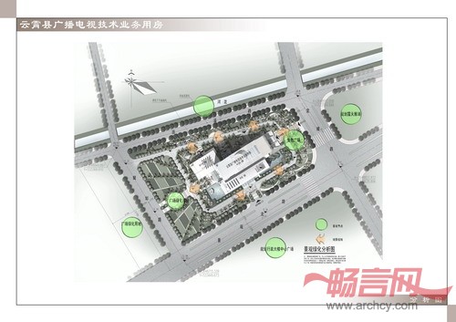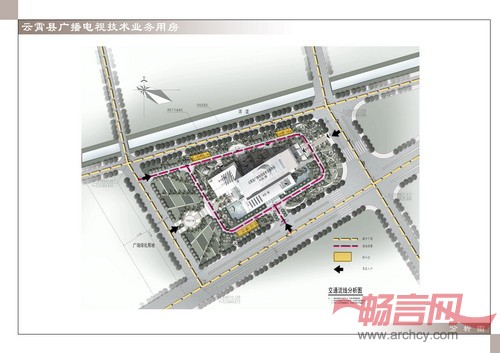 本建筑共分四种主要功能:对外服务大厅、数字电影、广电办公、演播多功能大厅等。各种功能分区明确又相互联系,均以内廊、走道进行联系,形成一个功能完整、分区明确的公共建筑。对外服务大厅入口设于南侧的景观北路,面向规划的行政楼广场,具有很强的对外特性。北侧设办公入口及演播大厅入口;西侧设有数字电影厅的入口,在入口处设有集散小广场利于人流疏散。