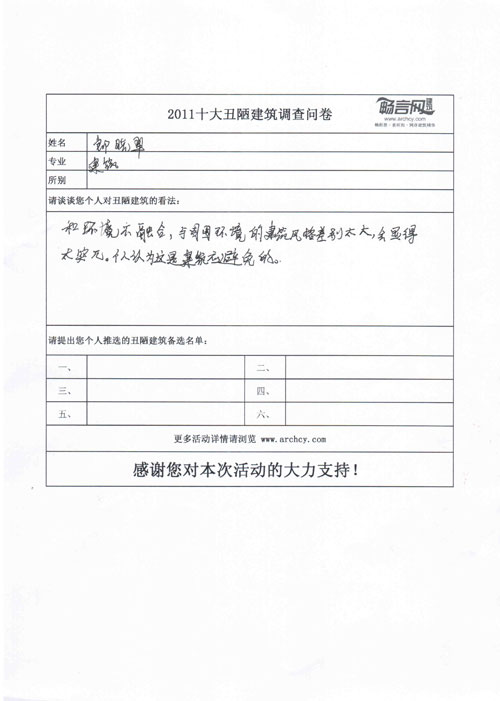 2011年12月16日,畅言网2011中国十大丑陋建筑50进20现场评选活动在北京成功举办,来自国建筑设计研究院、北京市建筑设计研究院、CCDI
