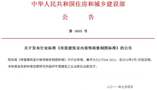由中华人民共和国住房和城乡建设部批准,东南大学建筑学院高祥生教授主持编写的《房屋建筑室内装饰装修制图标准》经住建部批准通过并于二零一一年七月四日