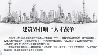 2011年,我们迎来了建筑设计行业第二个发展的“十年”,随着市场的逐渐成熟,竞争愈加激烈,设计人才的强弱成为一个建筑设计部门、一个企业竞争力的表