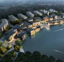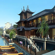 基地位于周庄古镇北侧,北临全旺路、秀海路,南接急水江与周庄古镇隔江相望。本项目是整个项目800亩用地中的商业部分,总建筑面积约1万平方米。一期建