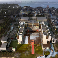该项目设计的主题为“江南映象”。层层叠叠的青瓦屋顶,灰白的墙面,交错的水系形成了江南建筑独特的美,设计师在设计中采用了折叠错落的深色大屋面,与江