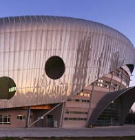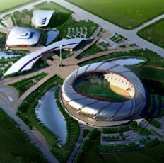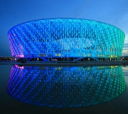 南昌国体中心体育场是一座不规则的椭圆形建筑,状如水滴,而用金属和玻璃为主要材料制成的明亮夺目的银色“外衣”线条流畅,使这个场馆有着水滴一般的晶莹