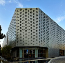 以“客家围屋,盛世舞台”作为原点,外立面半透明的网眼膜材包裹出富有韵律感的幕墙帷幔,有如当地人常用的凉帽一般遮蔽强烈的阳光,形成一个纱质的白盒子
