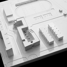 本项目由于场地的限制,北有住宅区,南面有现状住宅遮挡,临近高架桥干扰,基地面积非常小而且前后左右都受到限制,不可能像一个普通中学那样由很多不同功