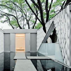 华鑫办公集群位于桂林路西,其入口南侧是一块绿地。这块绿地面向城市干道的开放属性,以及其中的六棵大香樟,成为了设计的出发点,并由此确立了展示中心的