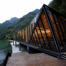 这座由三角形的玻璃和钢结构组成的餐厅位于中国南部一个深山峡谷的小河边上。