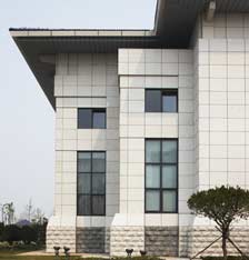 建筑群以中国传统建筑手法为基础,结合现代功能需求,建筑色彩以宁静和谐的篮灰色系为主,格调简洁明快,庄重典雅,突出品味。