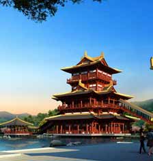 剧院功能与形式高度统一,规模宏大气势雄伟。酒店区采用轻松自由的“庭苑”式格局,中间为太液池,池北坐落登春阁,亭台楼阁,水波倒影,惬意悠闲。