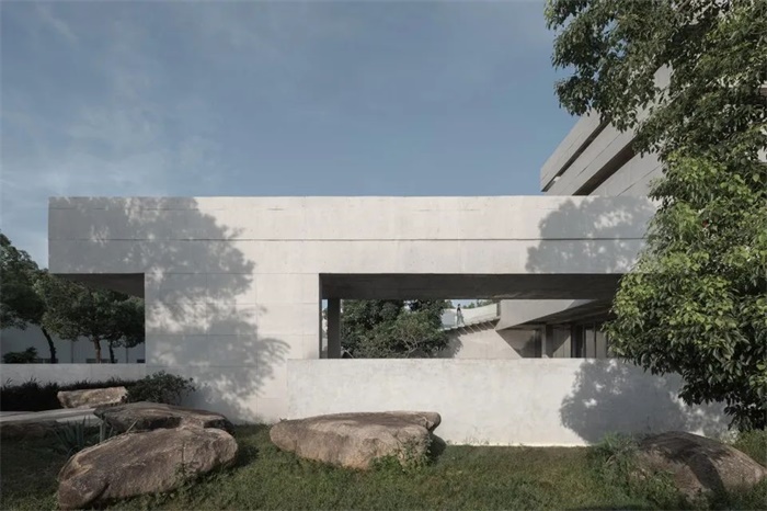 横跨水面上的平缓的台阶,行进犹如平地步行感受但又有身体抬升之用,可使人轻松拾级至第一级平台,在此过程体验场所的步移景异。平台有意拉长,延伸至庭院