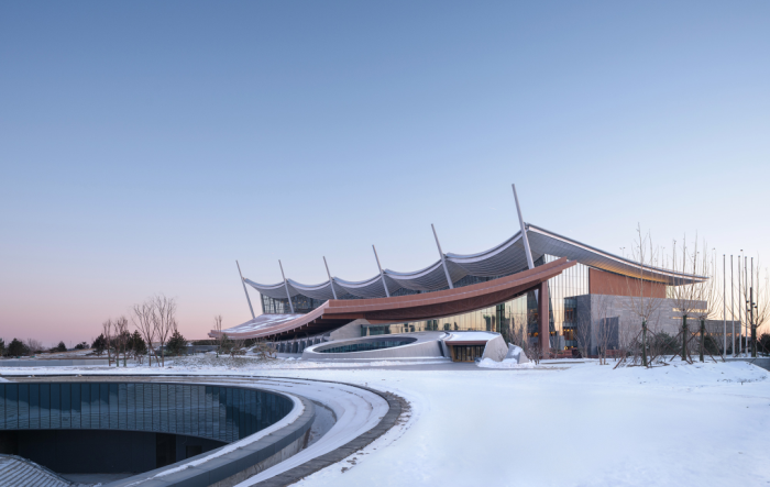 郑州国际文化交流中心建筑整体犹如一条玉龙,卧于龙湖之滨,首尾呼应、蜿蜒包容,通过建筑形体的拓扑变化组合,与开放的城市空间及周边环境完美契合。自然