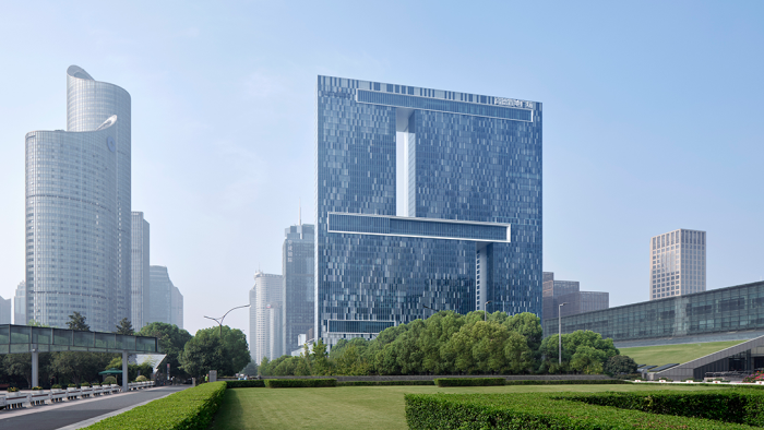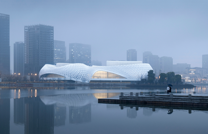 SOM的设计在建筑北立面打造出闪烁的光影效果,形成一个“站立的西湖”。宏大的北立面唤起人们对西湖天然之美的体验,也很好地衔接了毗邻的公园和市政建