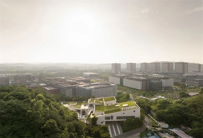 场地坐落于深圳银湖山与城市界面之间,设计将建筑作为自然与城市的栖息地。根据场地高差因地制宜,减少开挖,还原坡向体验,构筑“山谷叠台”与周边相融,