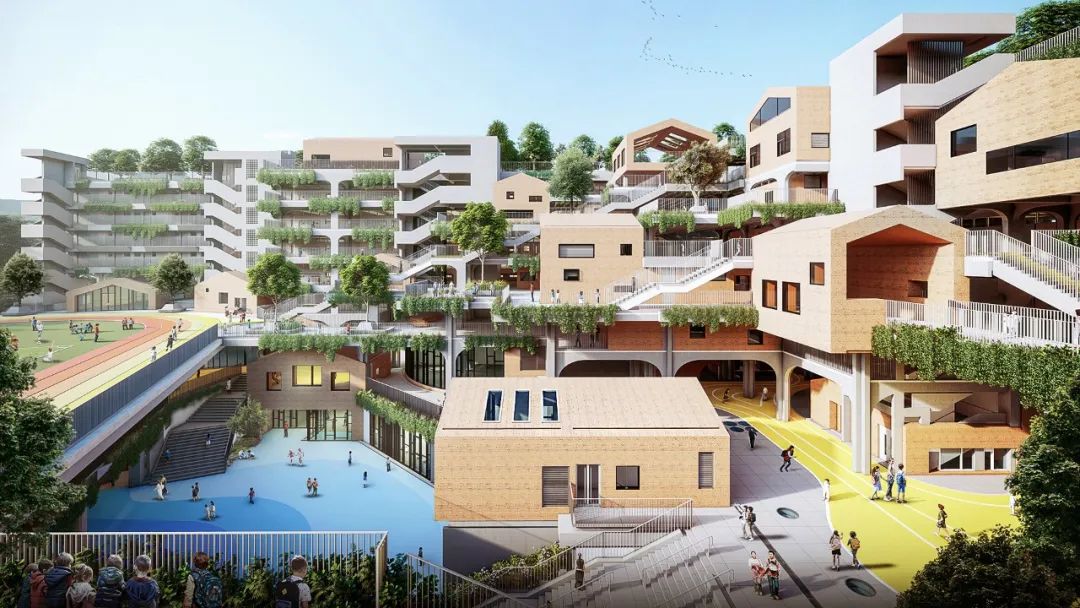 项目位于深圳市罗湖区莲塘片区,位于粤港路和百世路的交界处。基地南北侧和东侧为居住用地,西侧为工业用地。学校北侧和东侧被高密度住宅建筑包围,南侧周
