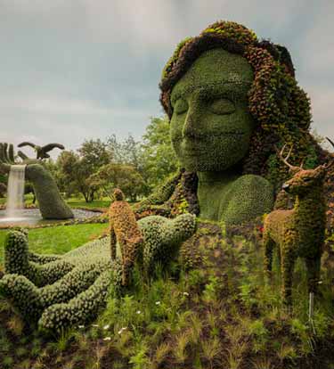 加拿大蒙特利尔植物园正在展览40个由植物构成的雕塑景观作品。今年的蒙特利尔国际多彩文化节展示了2D和3D结构,200名设计人员来自20余个国家,
