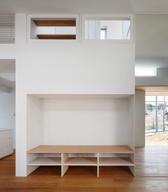 地面和天花板采用了木质材料,而一楼的墙壁则采用了白色调和镜面装饰,这样就增加了室内自然采光,而且镜面还可以照映室外的绿色植被。此外,灰色外墙周围