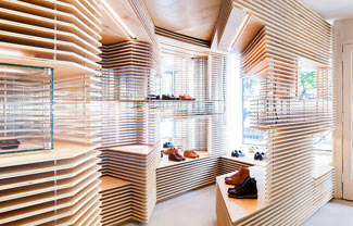 澳大利亚设计师Jordana Maisie完成了纽约曼哈顿鞋店室内装饰。Feit是定位高端消费人群的鞋业品牌,商店室内设有用层合板构造的不对称的