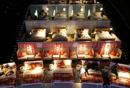 当地时间2014年12月7日,俄罗斯莫斯科郊区希姆基,家具零售商宜家将一处电影院内的座椅全部更换为宜家家居,17张双人床让观众可以躺着观看电影。