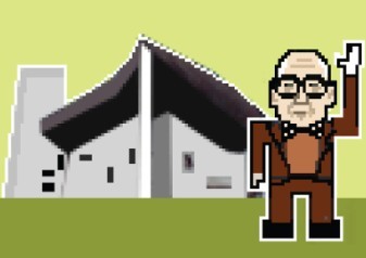 federico babina设计师设计了一系列国际知名建筑像素化的图形,每一位建筑师有着白色或黑色轮廓,搭配期著名建筑代表作作为背景,用有限的
