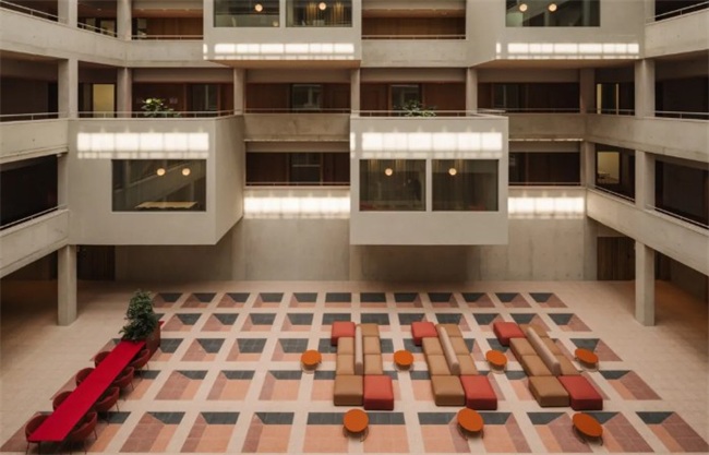 华沙大学心理学院的新院楼重新定义了学术空间的概念。这不仅是一栋服务于教学的建筑,更是一处支持人与人之间关系、促进大学与城市对话的场所。它将教学功能与开放精神和可持续设计理念融为一体。新建筑最具辨识度的特征之一,是贯穿整个首层的混凝土格构顶棚。它在室内与室外同时可见,形成统一而强烈的建筑母题,将建筑牢牢锚定于周边环境之中。顶棚之下,是一处向公众开放的灰空间:绿植、座椅、交流场所与自行车停放设施交织其间,构成一个全天候可使用、遮阳避雨的友好环境。这一空间不仅向师生开放,也向奥霍塔社区居民与校园使用者敞开,自然地促成日常层面的互动。